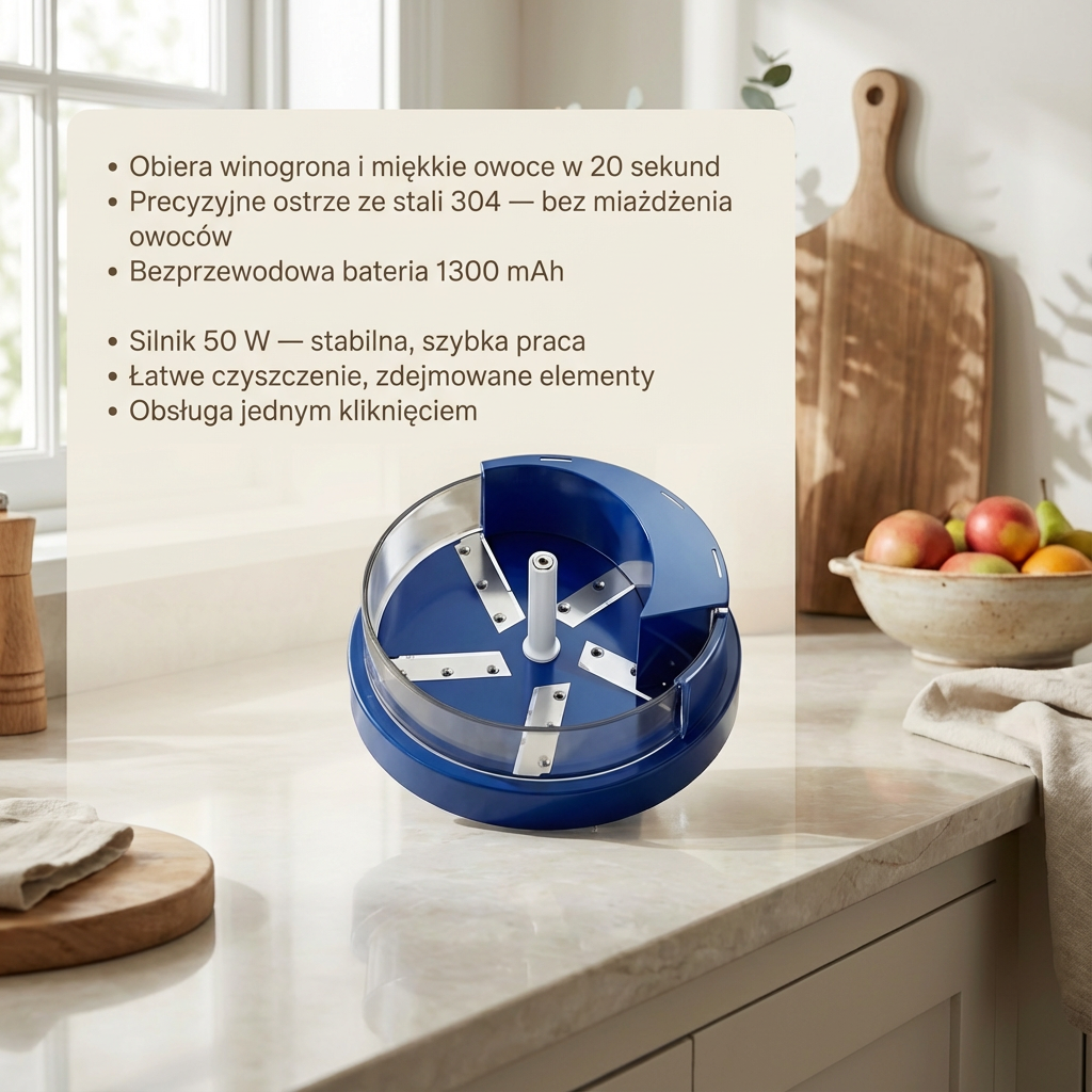 Oczywiście. PeelMaster™ działa w pełni automatycznie i bezstresowo — nie ma potrzeby dotykania żadnych ostrzy. Wystarczy włożyć owoc lub warzywo, nacisnąć jeden przycisk, a urządzenie zrobi wszystko za Ciebie. Idealne dla osób, które chcą oszczędzić czas lub uniknąć obciążenia dłoni.